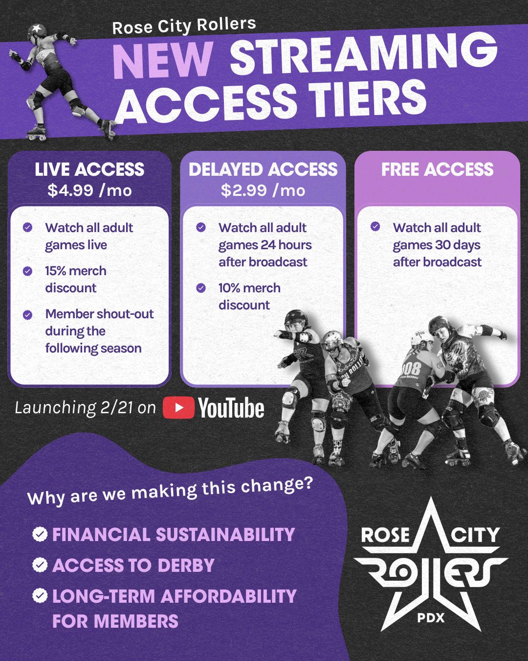Starting February 21, Adult Rose City Rollers games will be available through a YouTube Live Pass, a paid monthly membership on our YouTube channel that unlocks live and early access to games.