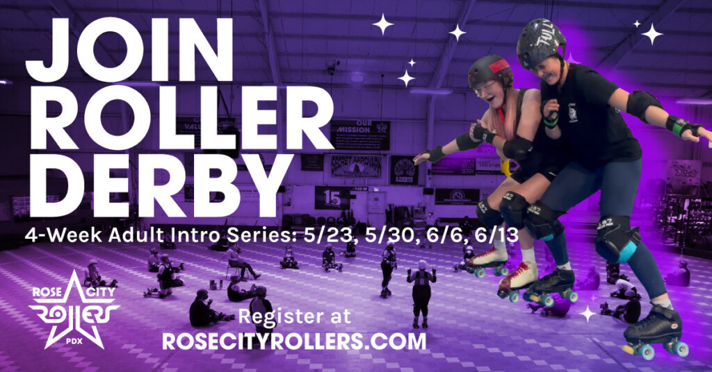 In this series, you will attend four 2-hour practices (once per week) where you will learn basic skating skills with a roller derby flair. Rental skates and gear are available via our Rent N Roll gear-lending library at no extra cost! At the end of the series, you can continue your roller derby journey by joining Rose City Rollers as a member!